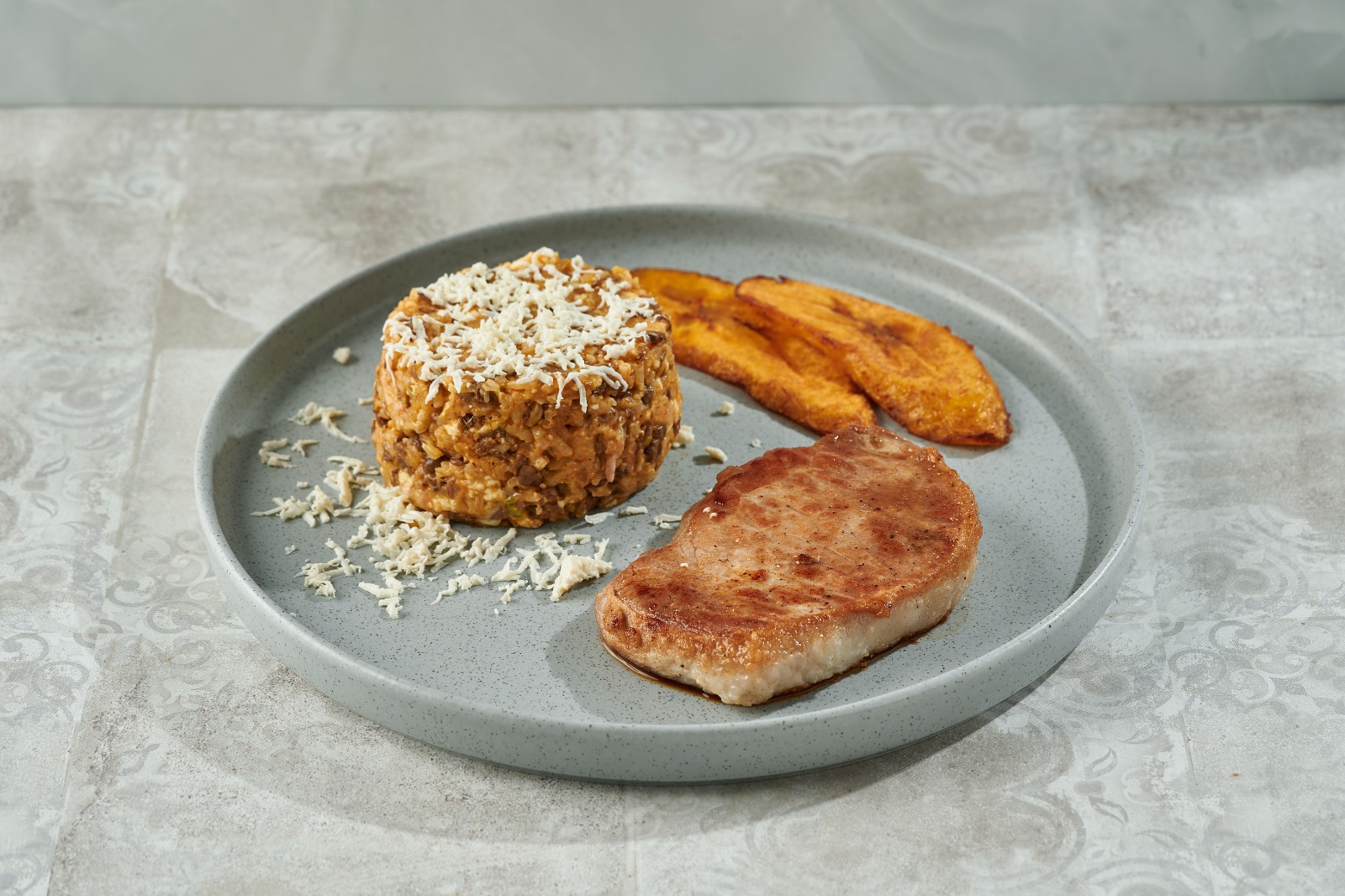 Calentado de lentejas con arroz, queso fundido y maduro, acompañado con carne de res o cerdo al grill.