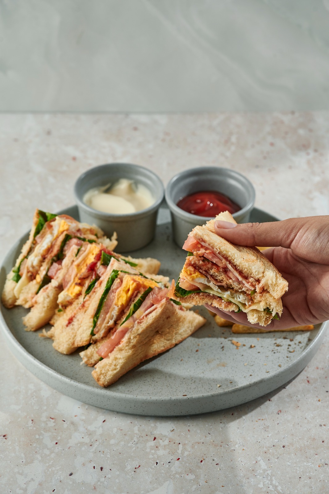 Sándwich de tres panes tostados con lechuga, tomate chonto, jamón, tocineta, huevo frito, queso mozzarella sobre una ligera capa de salsa de la casa. Acompañados de papas a la francesa.