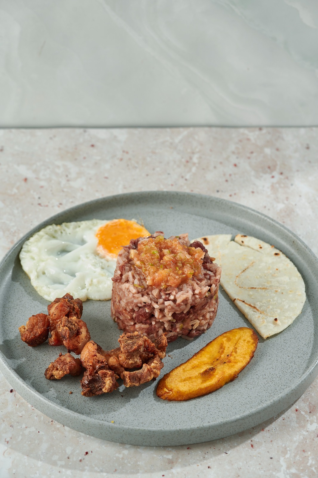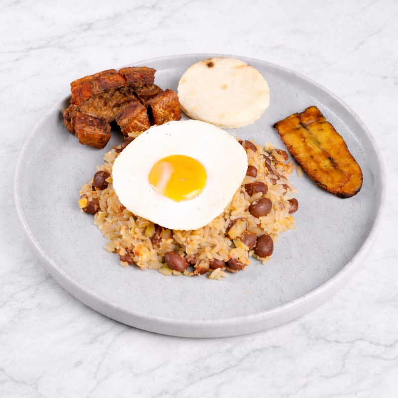 Calentado de frijoles, arroz, maduro, arepa y chicharrón.