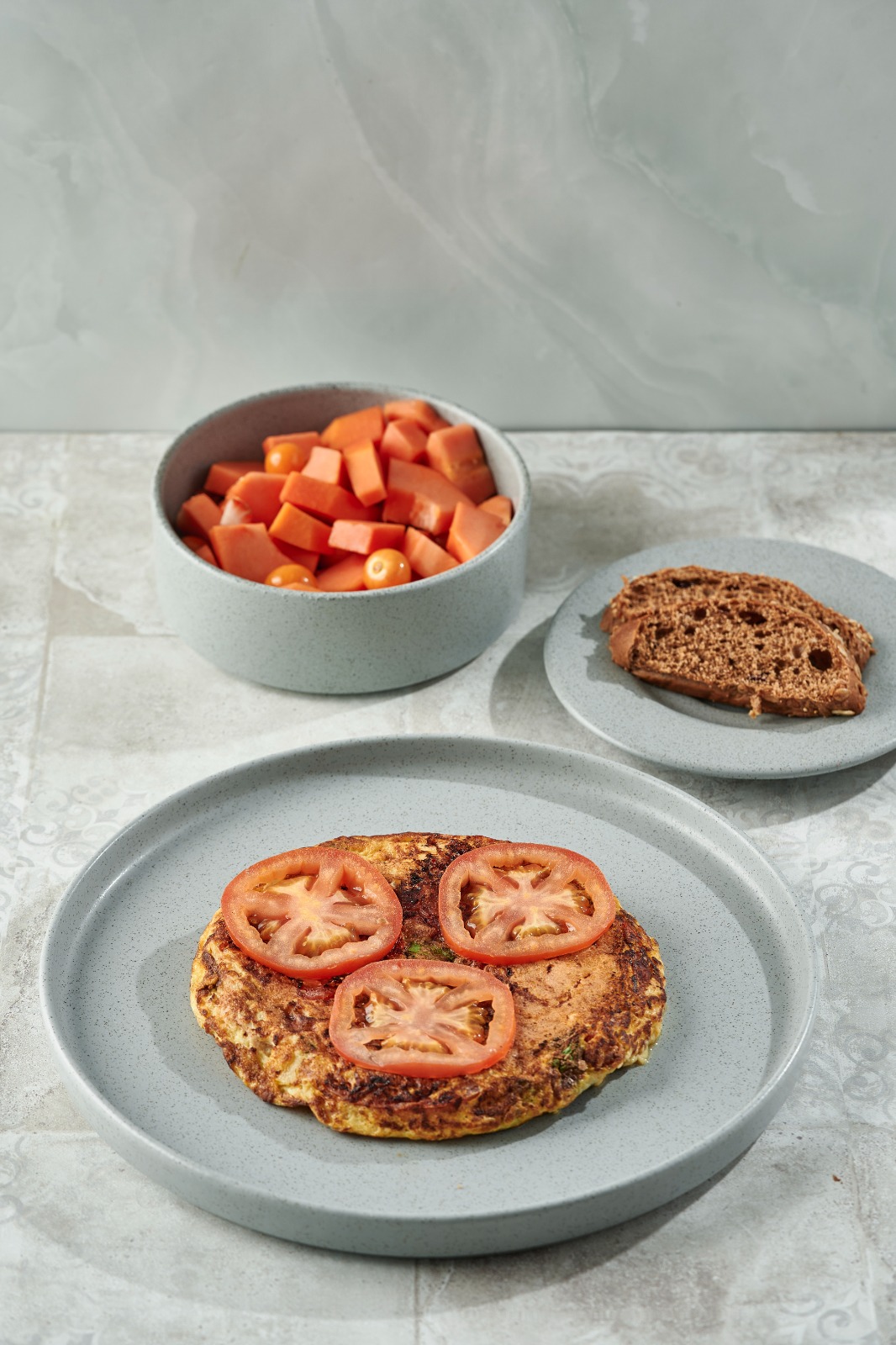 Tortilla de huevo con vegetales de temporada, jamón, queso con rodajas de pan tostado y fruta picada.