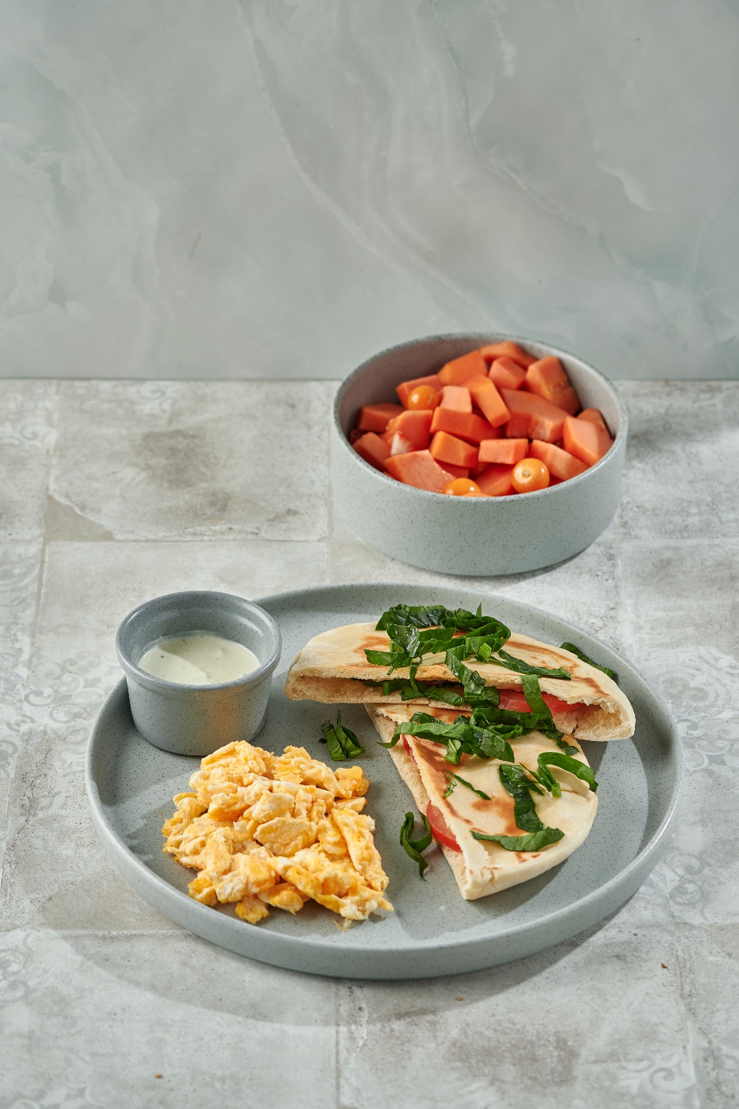 Sándwich de pan árabe con tomate chonto, queso y albahaca bañado con vinagreta de la casa, huevos al gusto (revueltos, pericos, fritos). Acompañado de fruta picada y yogur.