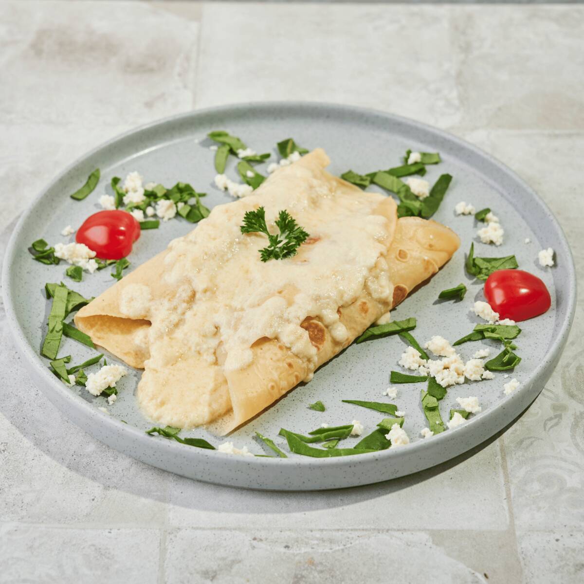 Delicadas crepes artesanales rellenas de una mezcla cremosa y reconfortante de espinaca salteada y queso ricota, que aportan frescura y suavidad en cada bocado. Estas crepes se gratinan con una salsa suave y sedosa, enriquecida con quesos seleccionados, que aportan profundidad de sabor y un toque dorado irresistible.