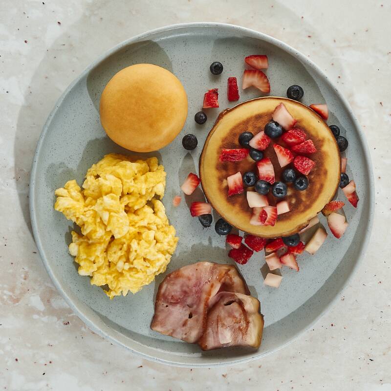 Delicioso pancake con fruta, miel, cereal con yogur, huevo revuelto con jamón y regalo sorpresa.