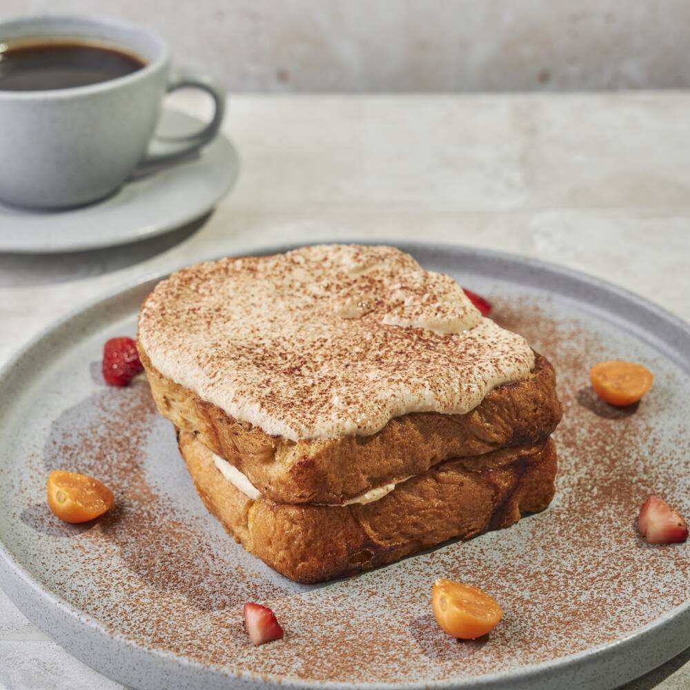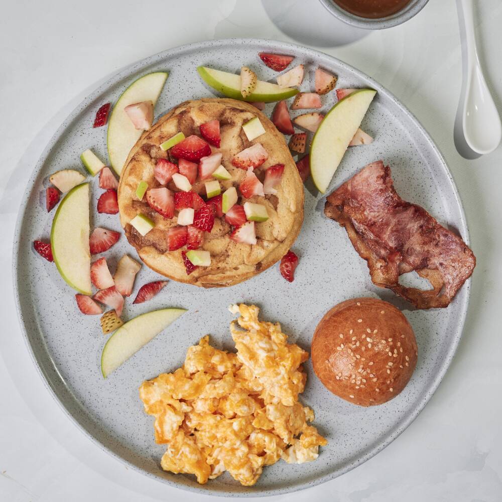 Una versión cálida y reconfortante del clásico desayuno. Pancakes elaborados con mezcla de harina infusionada con manzana, que aporta dulzura natural y suavidad a cada bocado. Acompañados de una lonja de tocineta crujiente y tostada de pan brioche, este plato se completa con una porción de nuestra mermelada artesanal, haciendo de esta combinación una opción ideal.