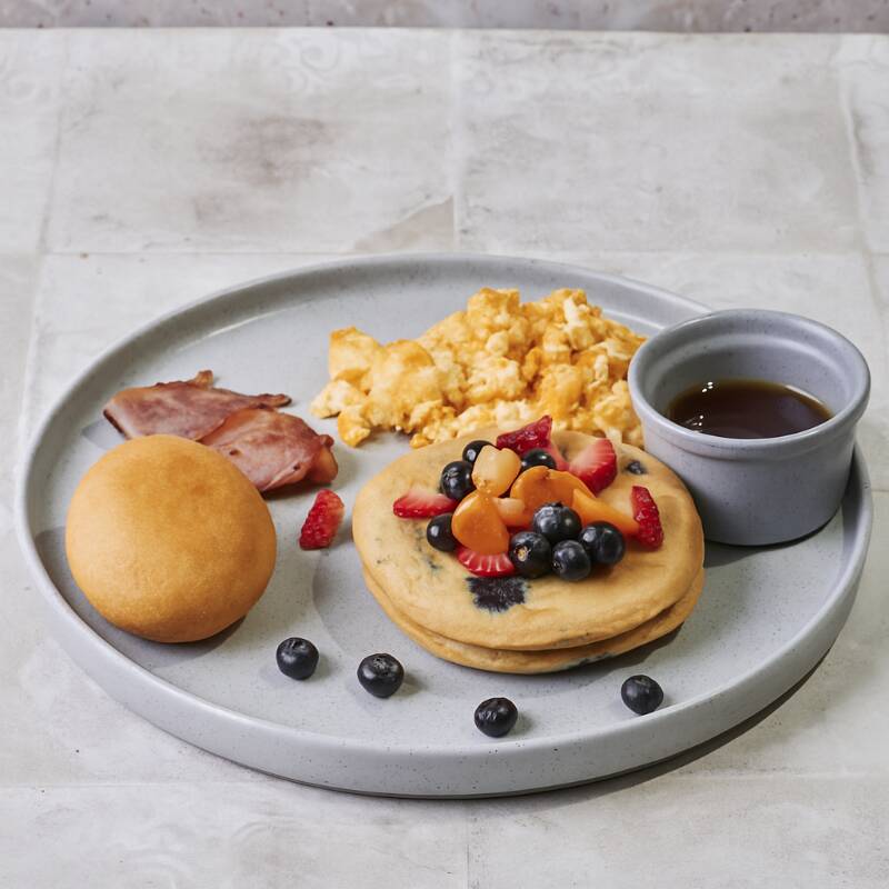 Pancakes preparados con harina de Arándanos, acompañado de miel de maple, Huevos al gusto (revueltos , pericos o fritos), Tocineta y Pan Brioche.