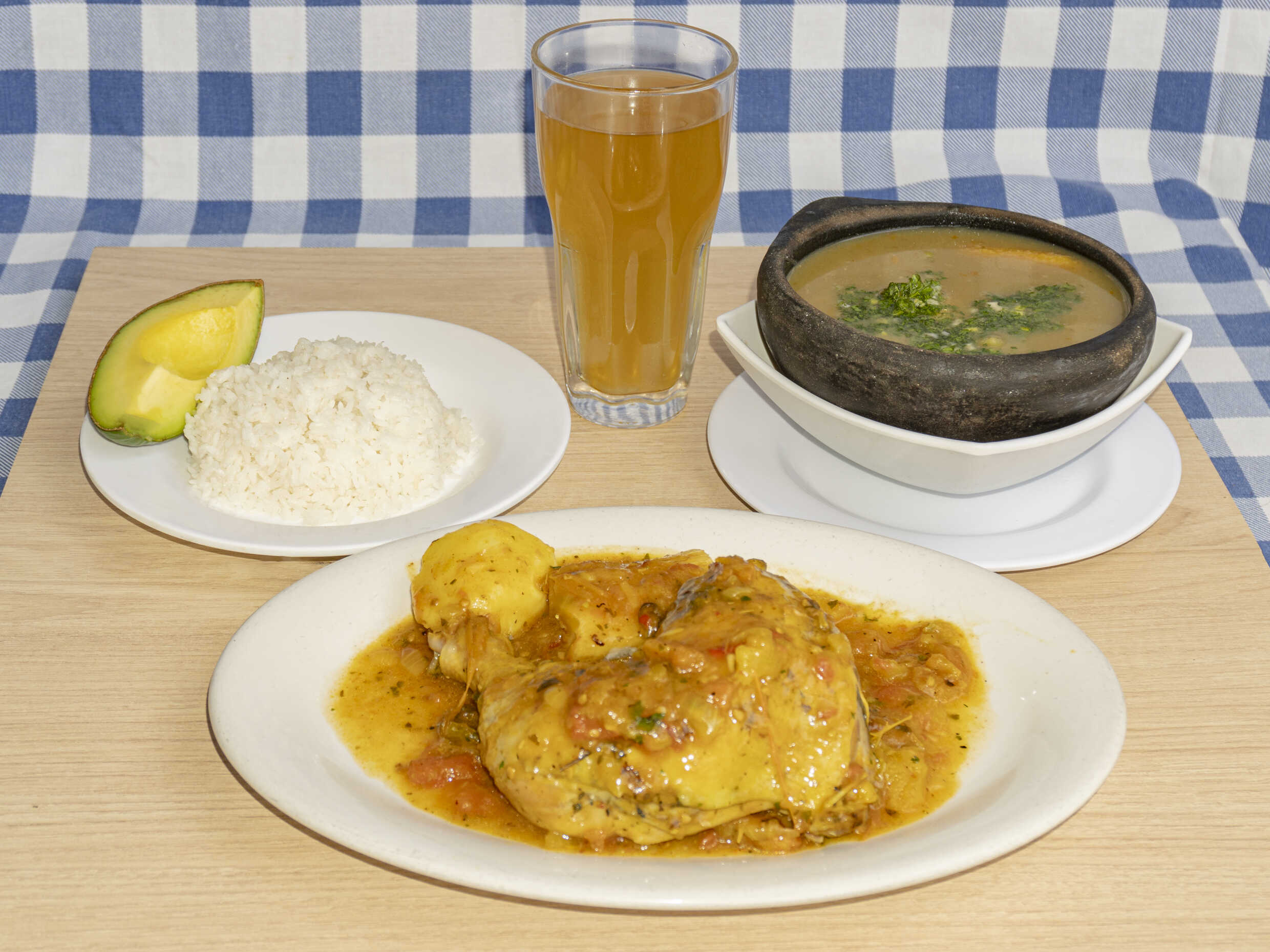 Sancocho de Gallina 24 onz, proteína a elección, acompañado de arroz, maduro, papa cocida, yuca cocida