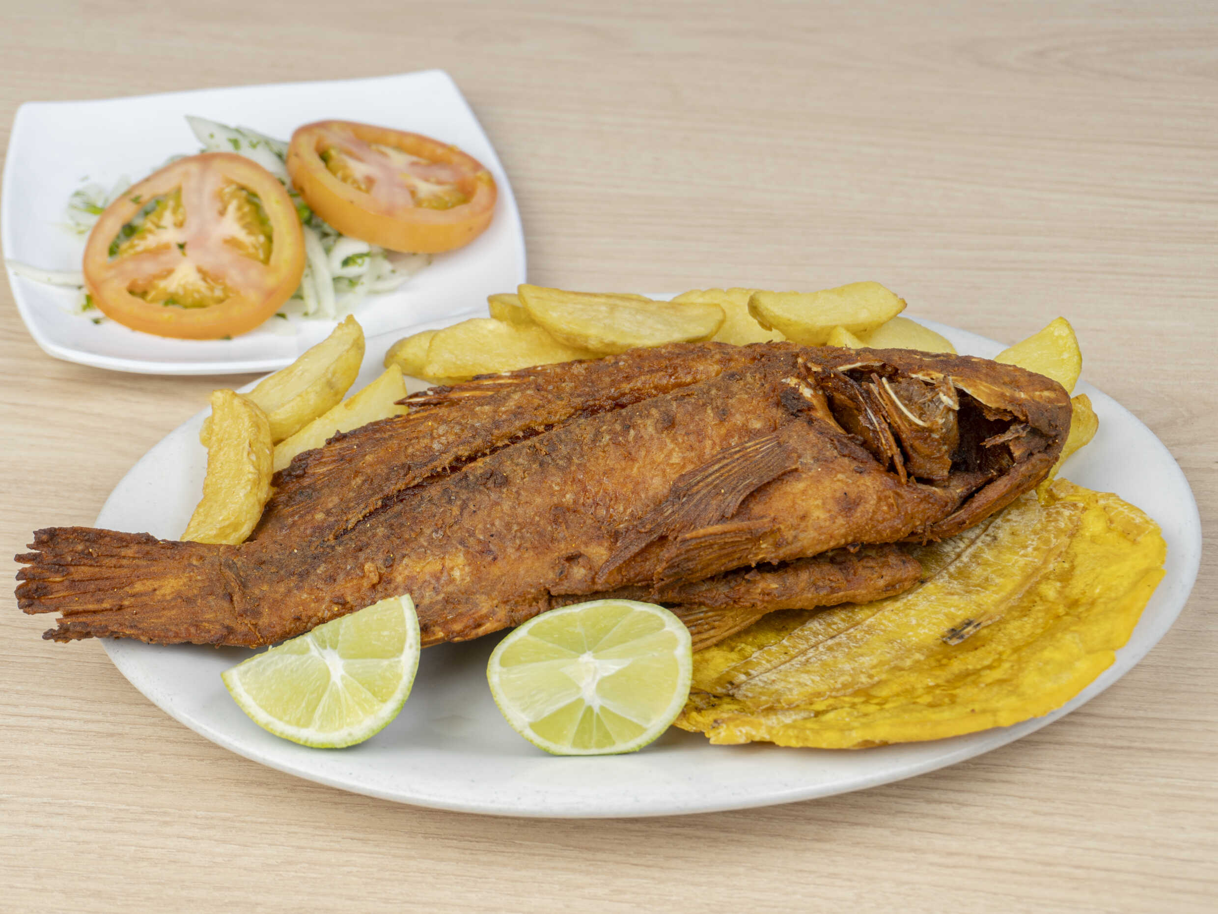 Acompañado de arroz, papas a la francesa, tostada de plátano, ensalada y limón