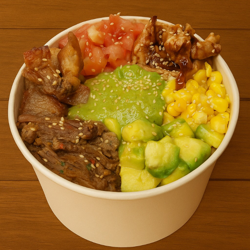 Delicioso bowl con triple en sabor, viene con carne desmechada en salsa casera, cerdo en salsa BBQ, chicharrón crujiente, maicitos, tomate, aguacate, ajonjolí y arroz, acompañado de guacamole.