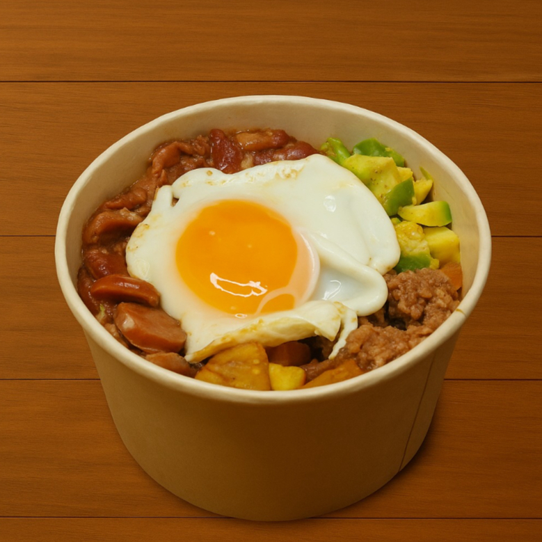 Delicioso bowl con sabores típicos, viene con chicharrón, carne molida, chorizo, huevo frito, frijoles, trocitos de maduro, aguacate y arroz.