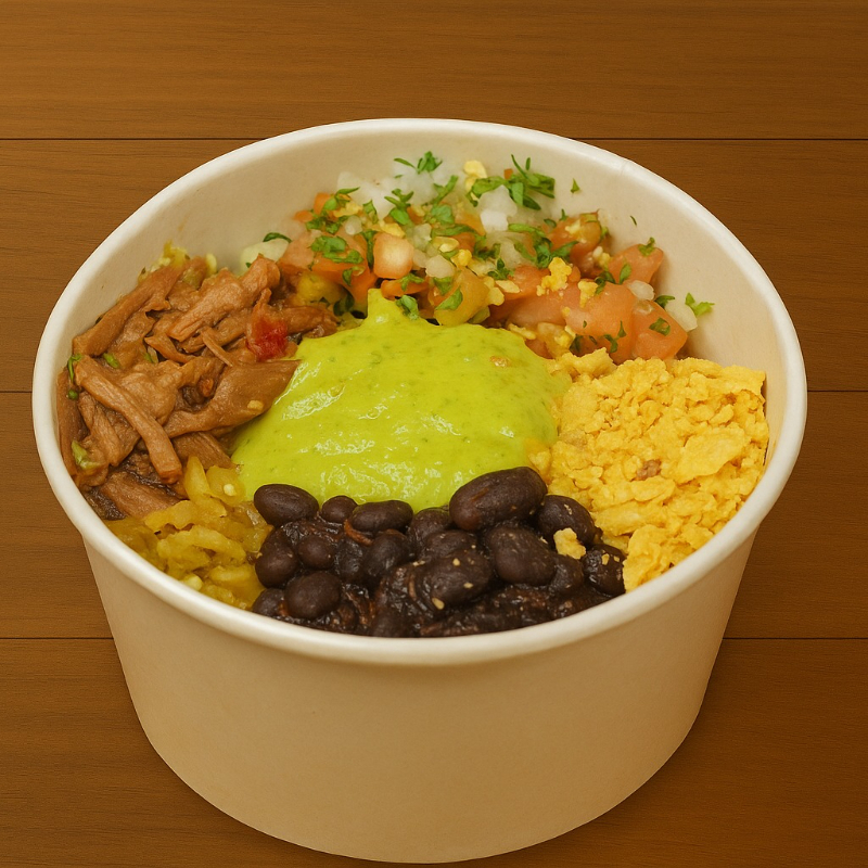 Delicioso bowl inspirado en sabores mexicanos, viene con carne desmechada en salsa casera, frijoles negros, pico de gallo, nachos triturados, arroz, acompañado de guacamole.