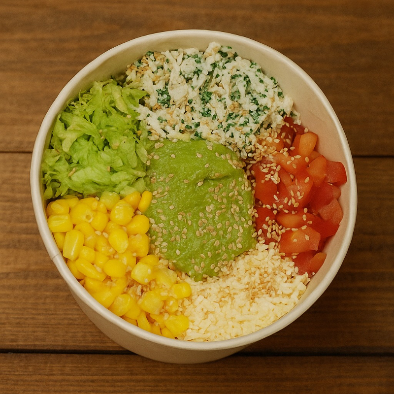 Delicioso bowl de pollo, viene con, pollo en salsa de cilantro, maicitos, queso parmesano, tomate, lechuga, ajonjolí, acompañado de guacamole.