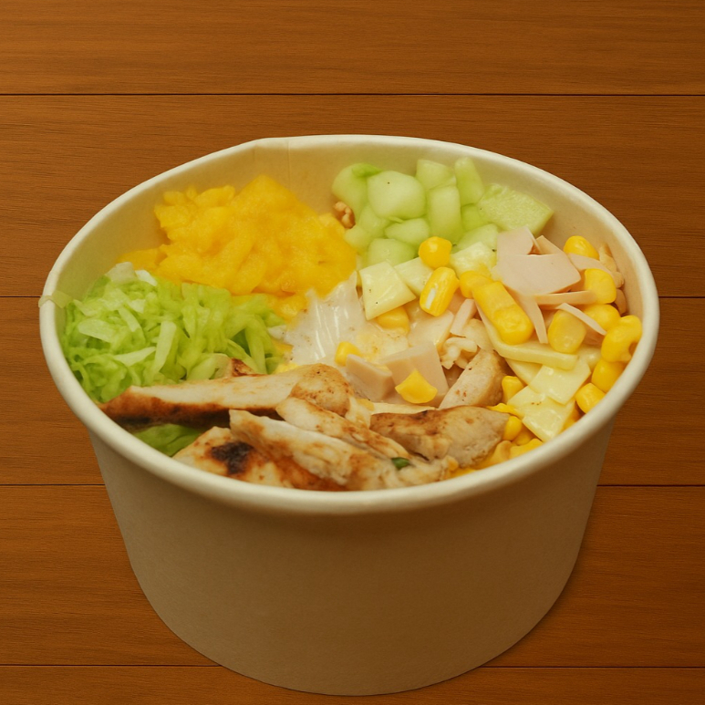 Delicioso bowl inspirado en sabores tropicales, viene con pollo a la plancha, jamón, queso mozzarella, piña, pepino, maicitos, lechuga y arroz.