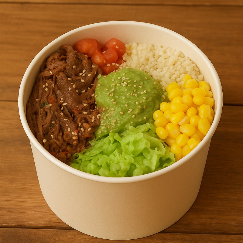 Delicioso bowl de carne, viene con carne en salsa casera, maicitos, queso parmesano, tomate, lechuga, ajonjolí, acompañado de guacamole.