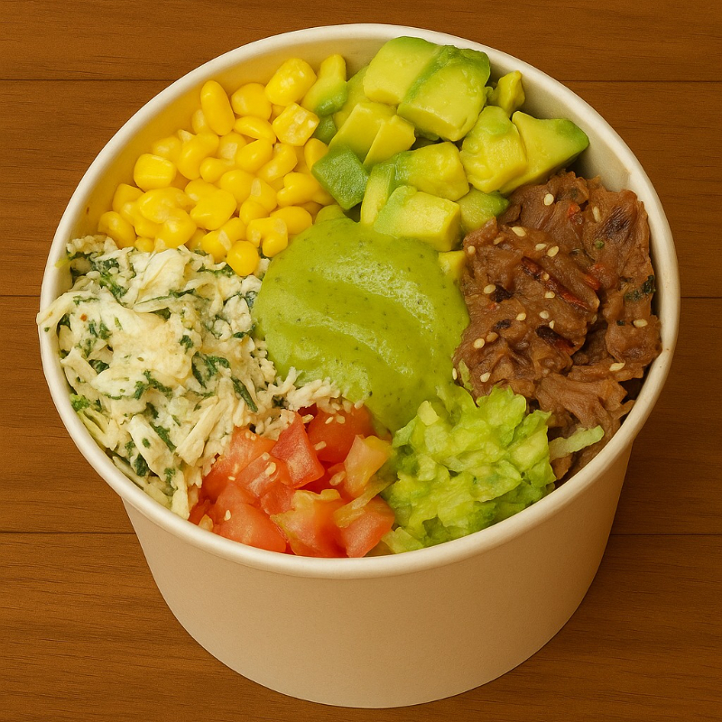 Delicioso bowl con doble sabor, viene con carne desmechada en salsa casera, pollo desmechado en salsa de cilantro, maicitos, tomate, aguacate, acompañado de guacamole.