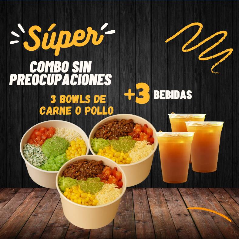 3 Bowls de Pollo o Carne + 3 Limonadas de Panela