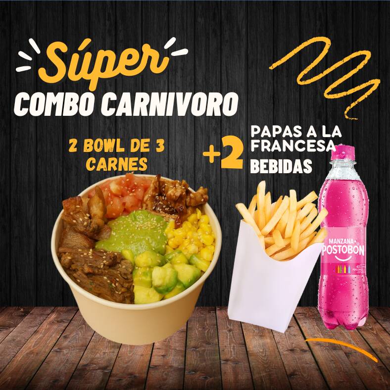 2 Bowls 3 Carnes + 2 Porciones de Papas a la Francesa + 2 Bebidas