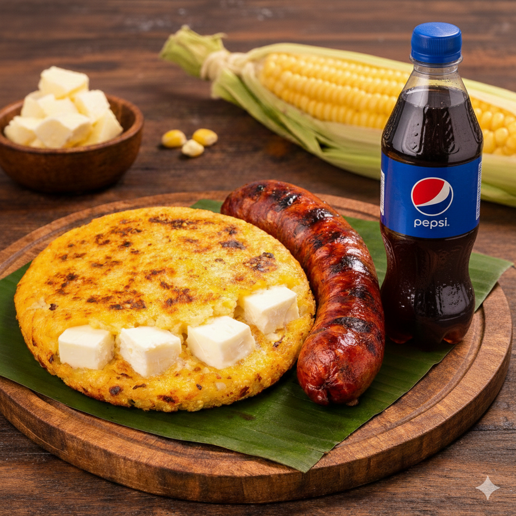 Delicioso combo con una Arepa de Choclo con Queso y un Chorizo Santarrosano de Cerdo + Bebida a eleccion (Sabor sujeto a disponibilidad de la tienda)