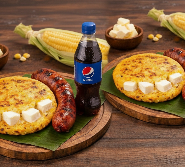 3 Deliciosas Arepas de Choclo con Queso y 2 Chorizo Santarrosano de Cerdo + 2 Bebida a eleccion (Sabor sujeto a disponibilidad de la tienda)