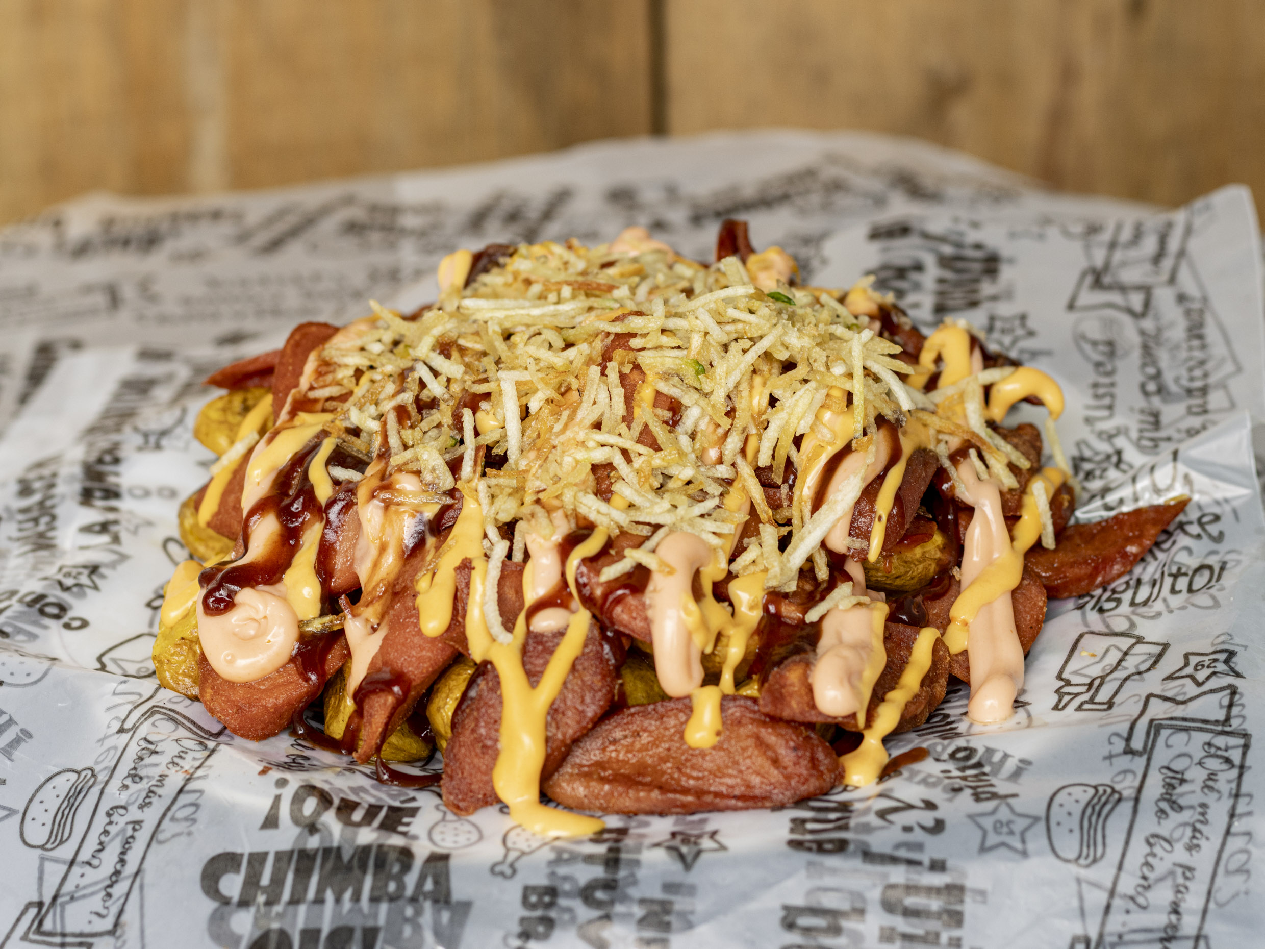 Papa, salchicha, queso, tocineta, carne de hamburguesa, maíz, chorizo, ripio y salsas.
