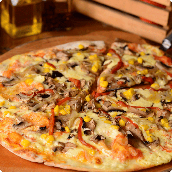 Champiñones, Pimentón Asado, Cebolla y Maíz Tierno.