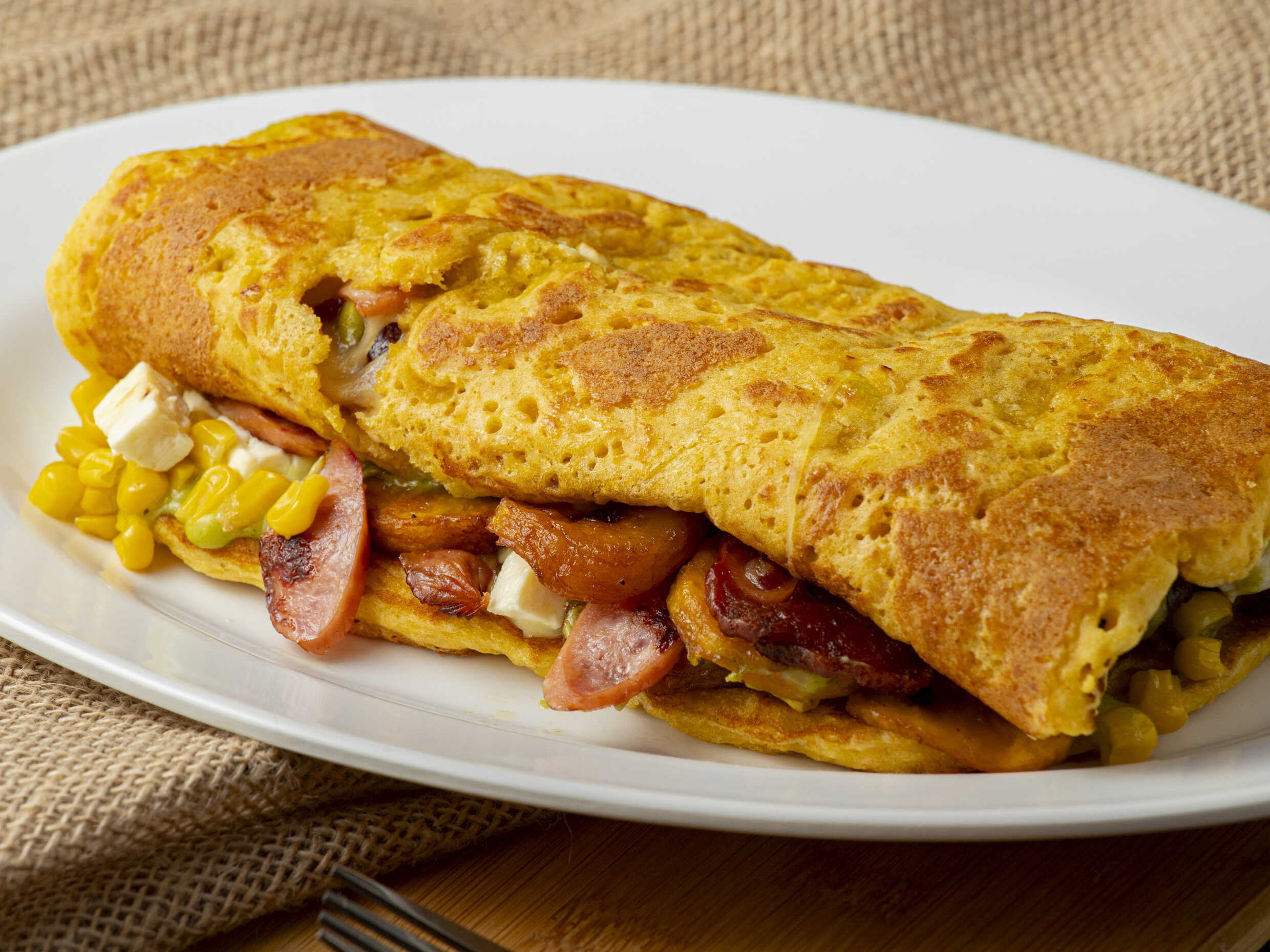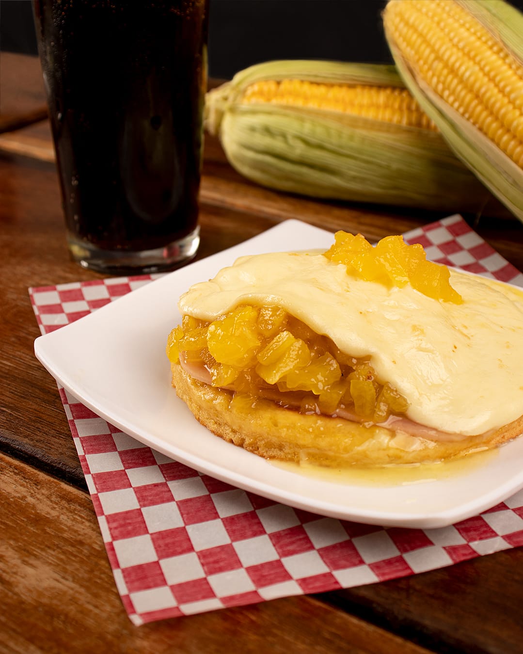 Base de choclo, queso crema, cuajada, Ranchera, jamón, tocineta, maduro y maicitos.