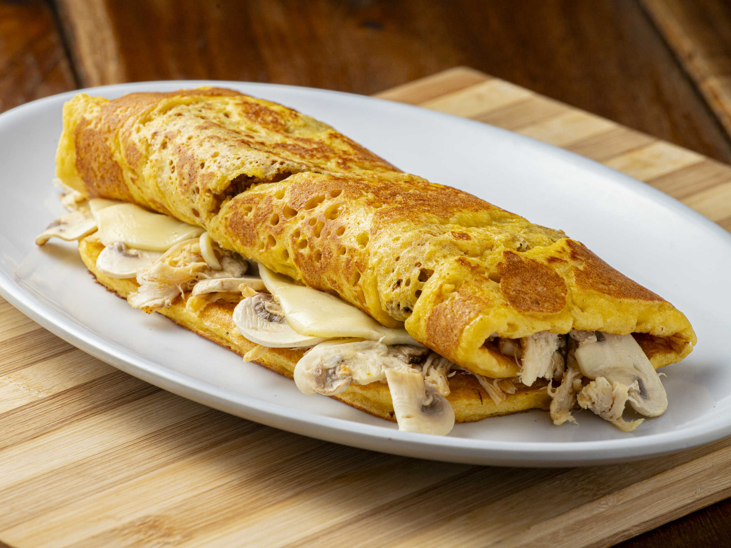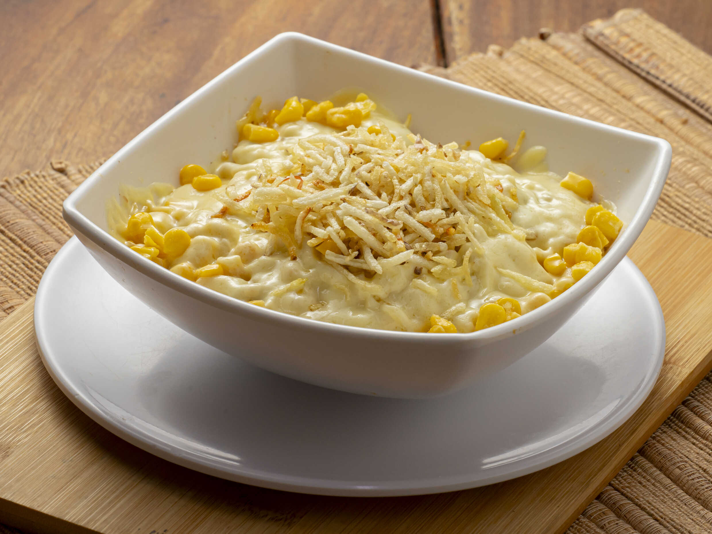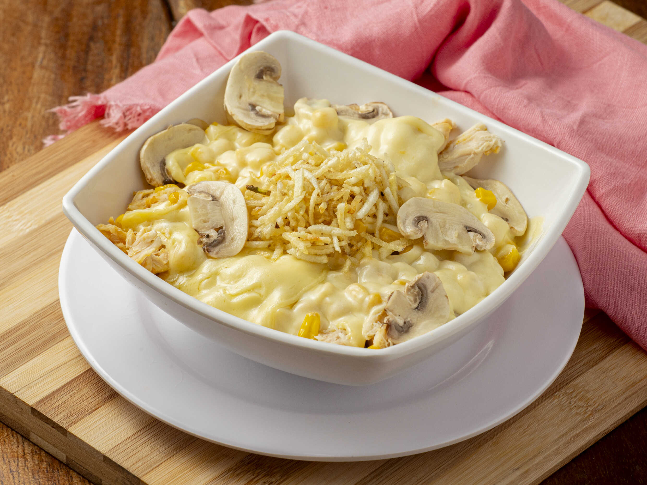 Base de choclo, pollo desmechado, champiñones, queso crema y salsa de showy.