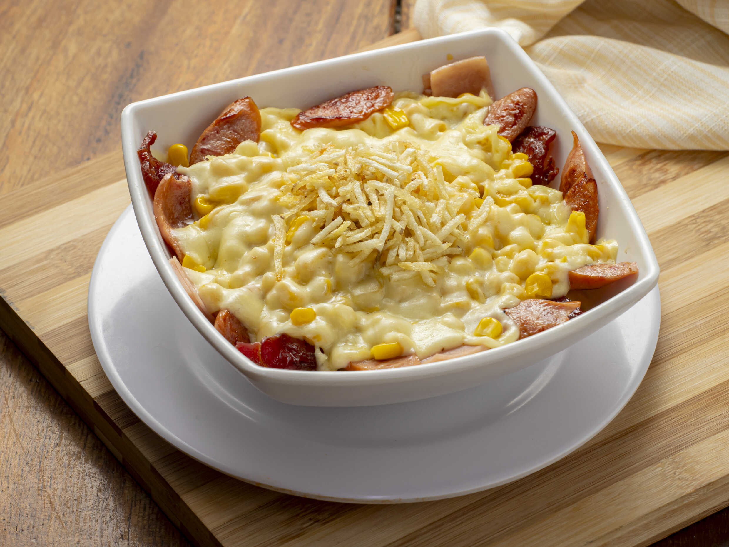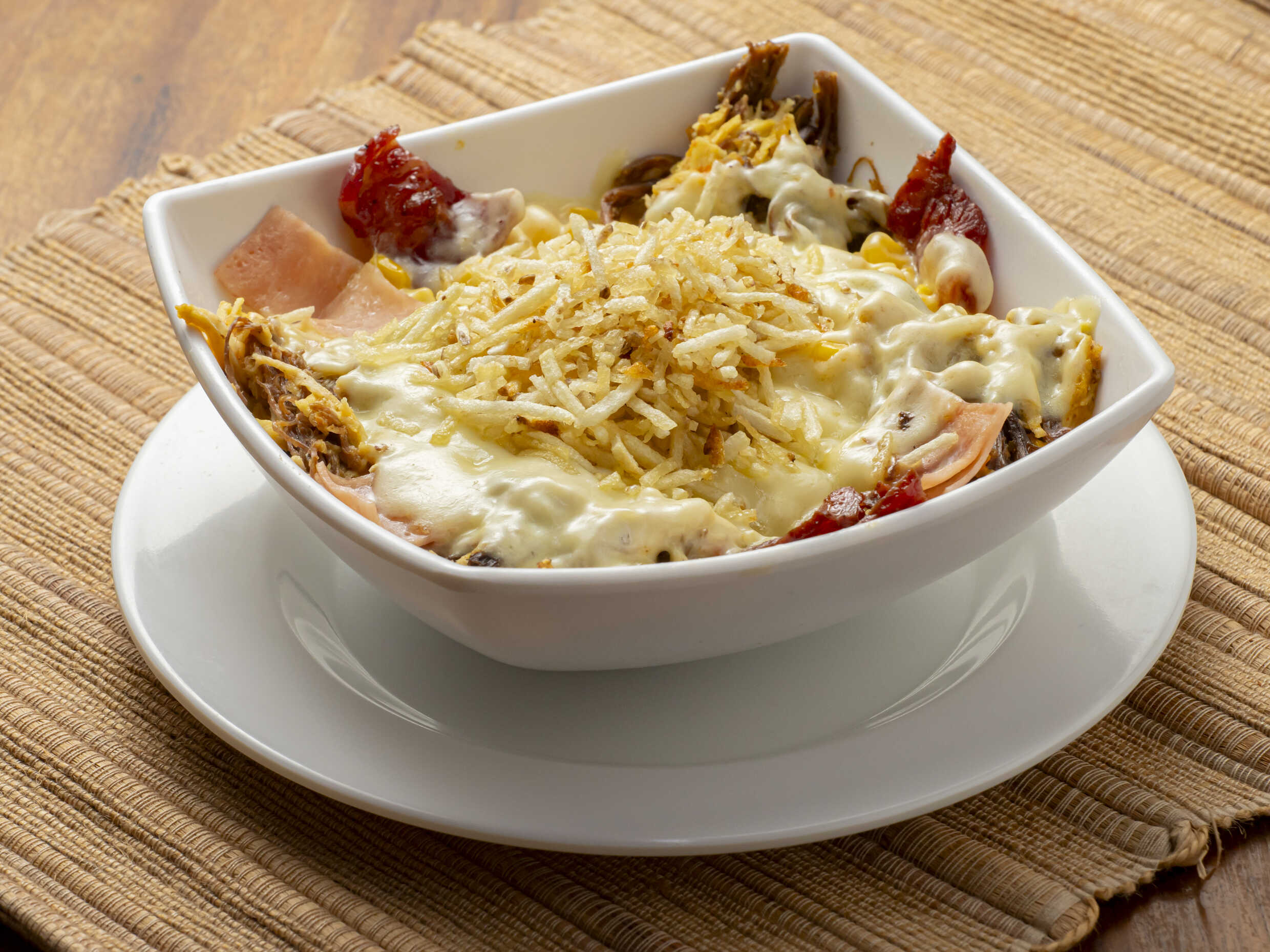 Base de choclo, pollo y carne desmechada, tocineta, queso crema y salsa de showy.