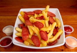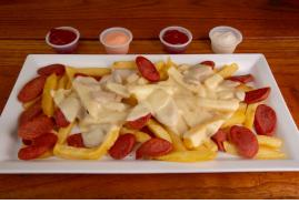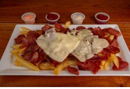 Papa, salchicha, tocineta, chorizo y Ranchera asada, queso crema, ripio.