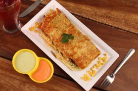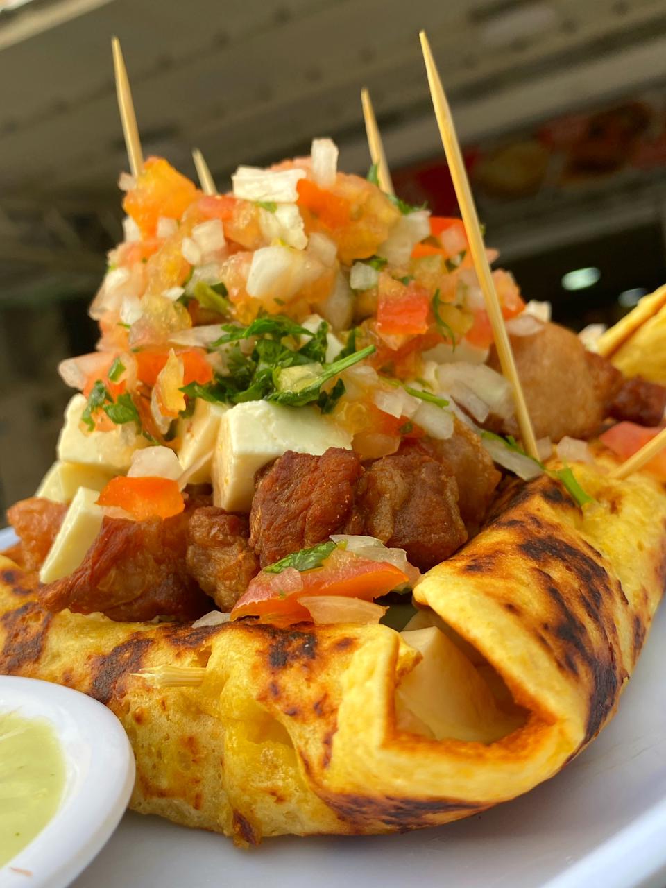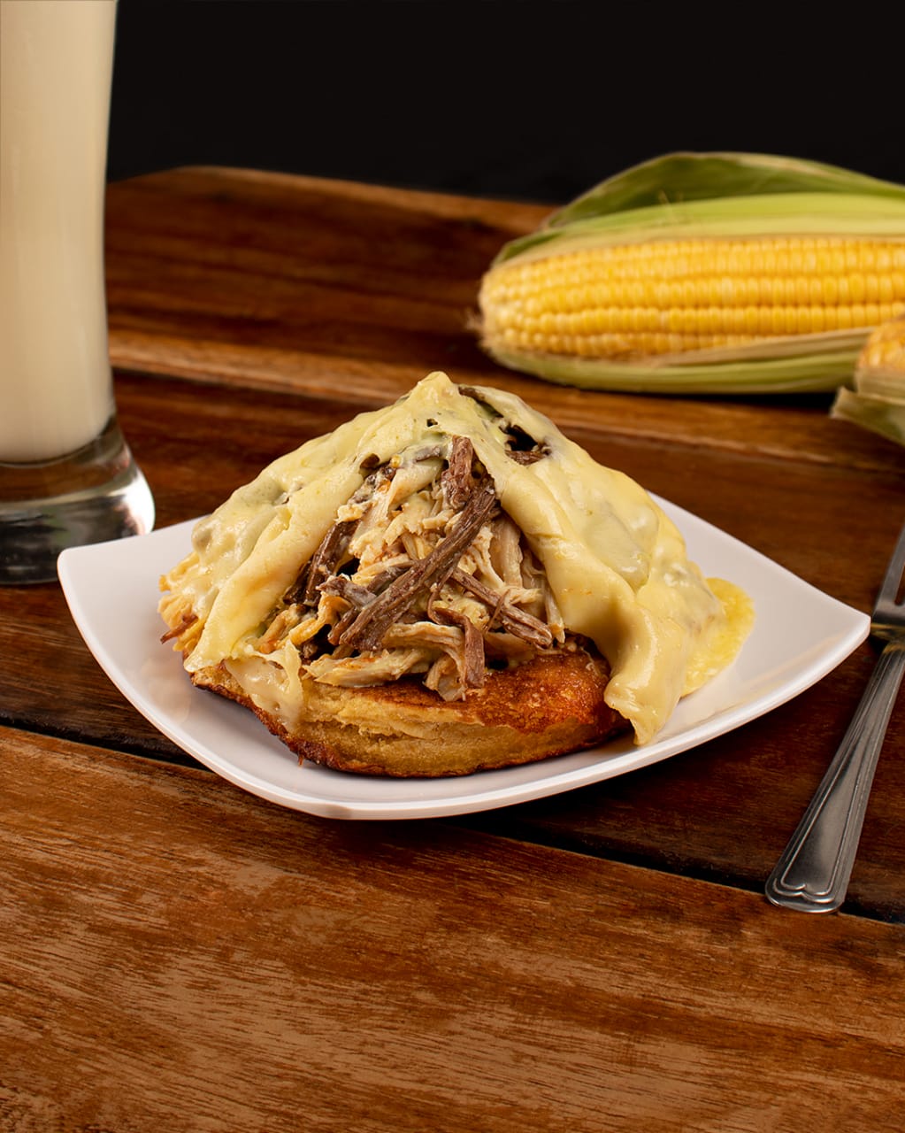 Base de choclo relleno con queso en trocitos, pico de gallo, chicharron y salsa de la casa