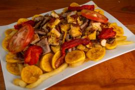 Carne, pollo, chorizo, plátano y papa a la francesa.