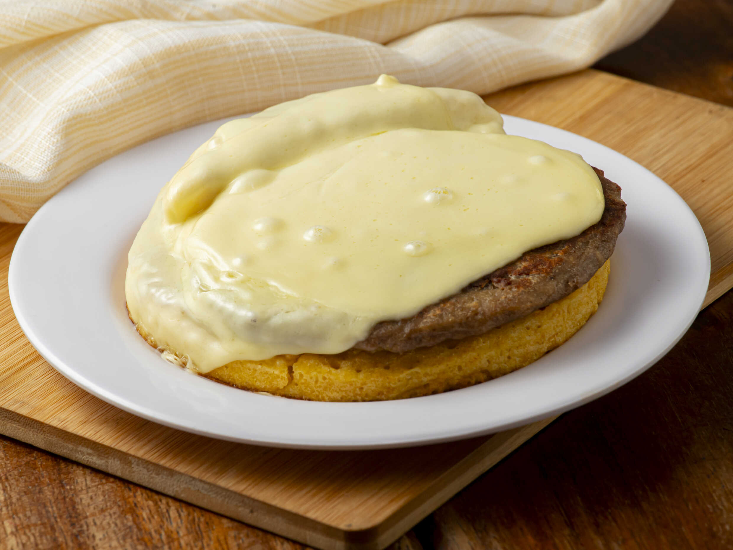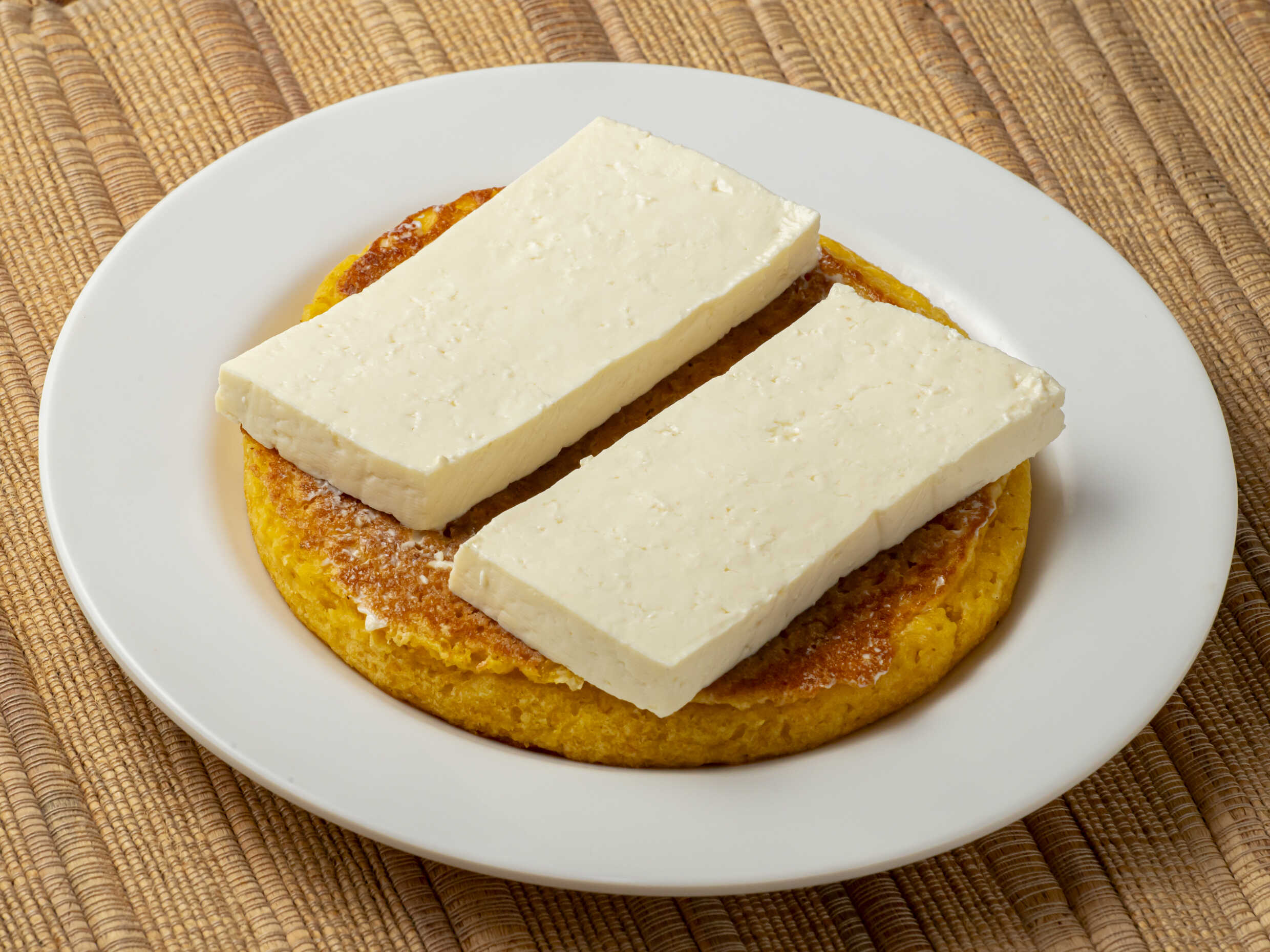 Base de choclo relleno con queso crema y cuajada, cubierta de queso crema.