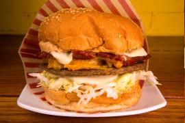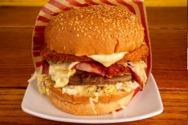 Doble carne, doble queso, lechuga, tomate, jamón, cebolla, tocineta, ripio.