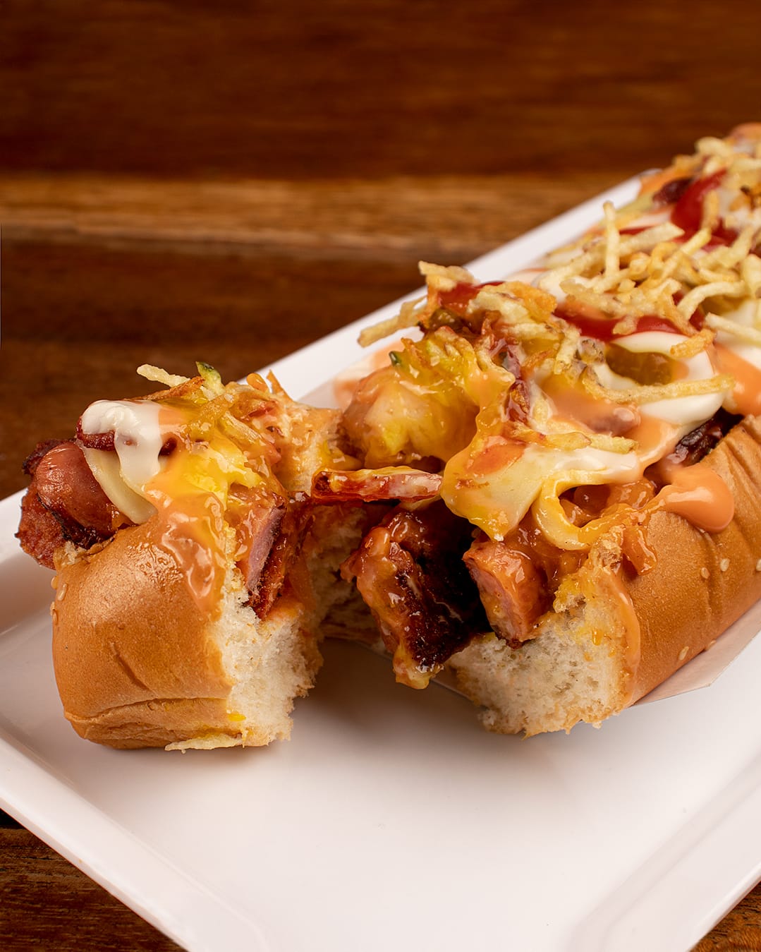 Salchicha, tocineta, cebolla, queso, jamón, ripio.