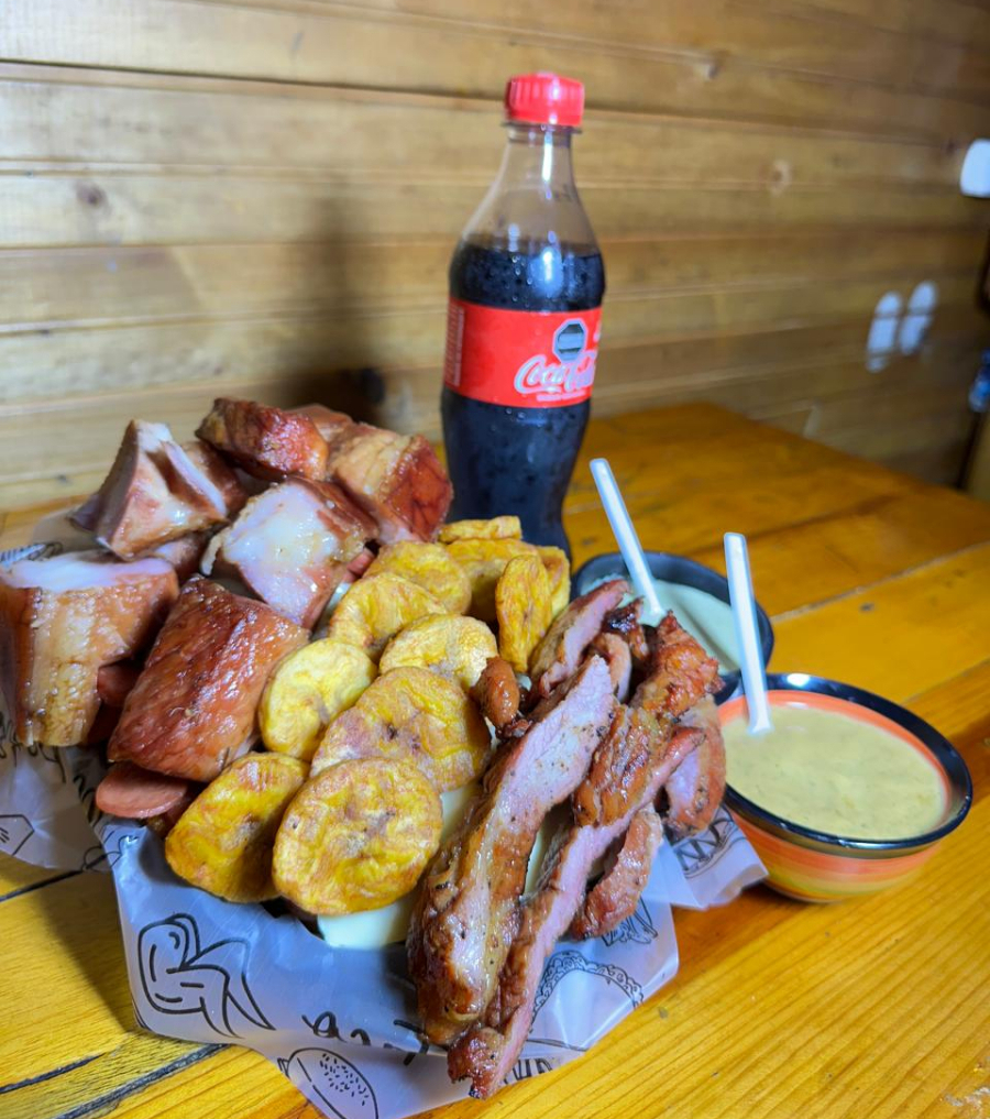 Chicharrón al barril, salchicha, costilla, papa amarilla, maduro y queso