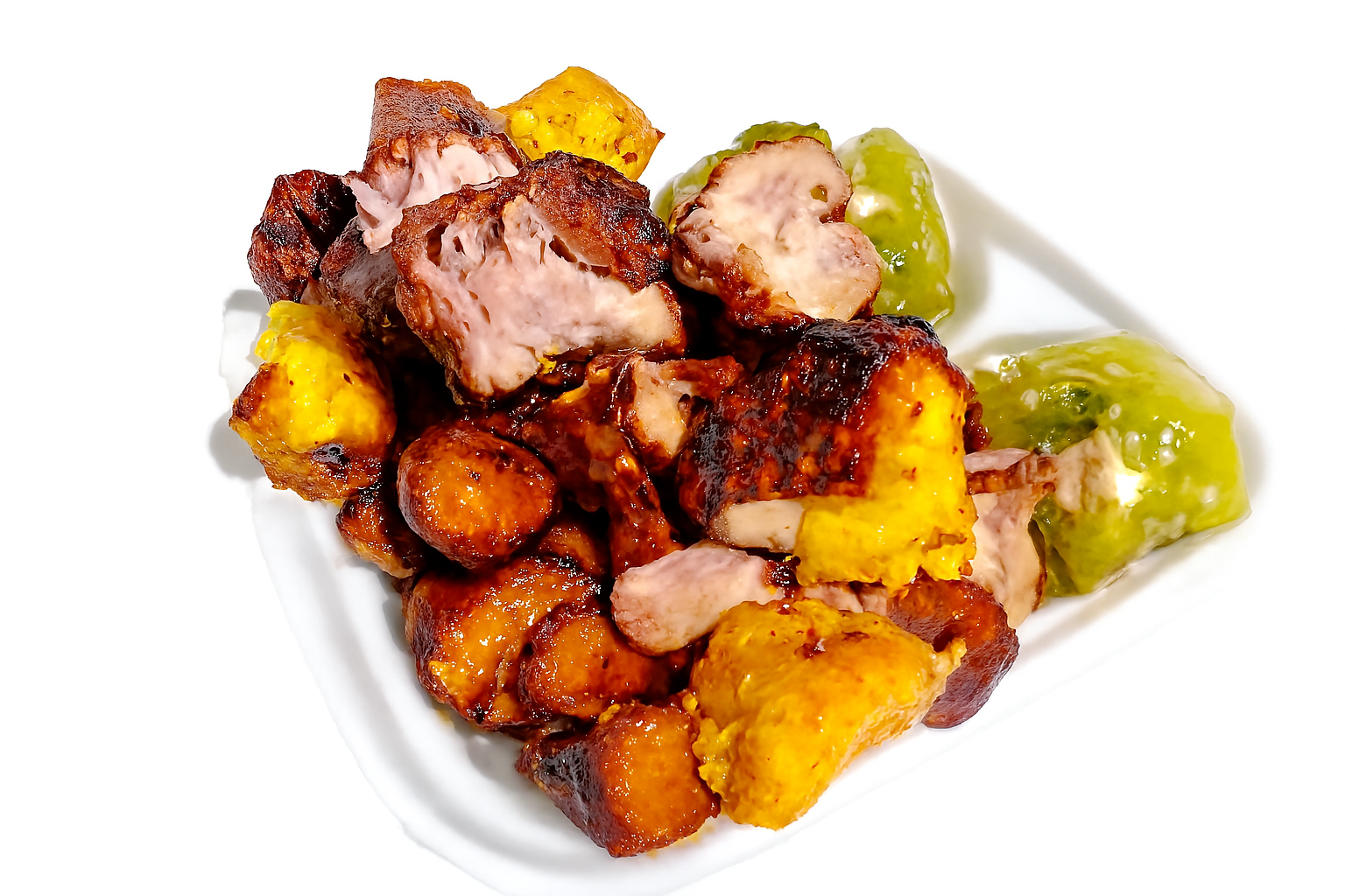 Chicharrón, costilla acompañado de papa cocida, maduro asado.