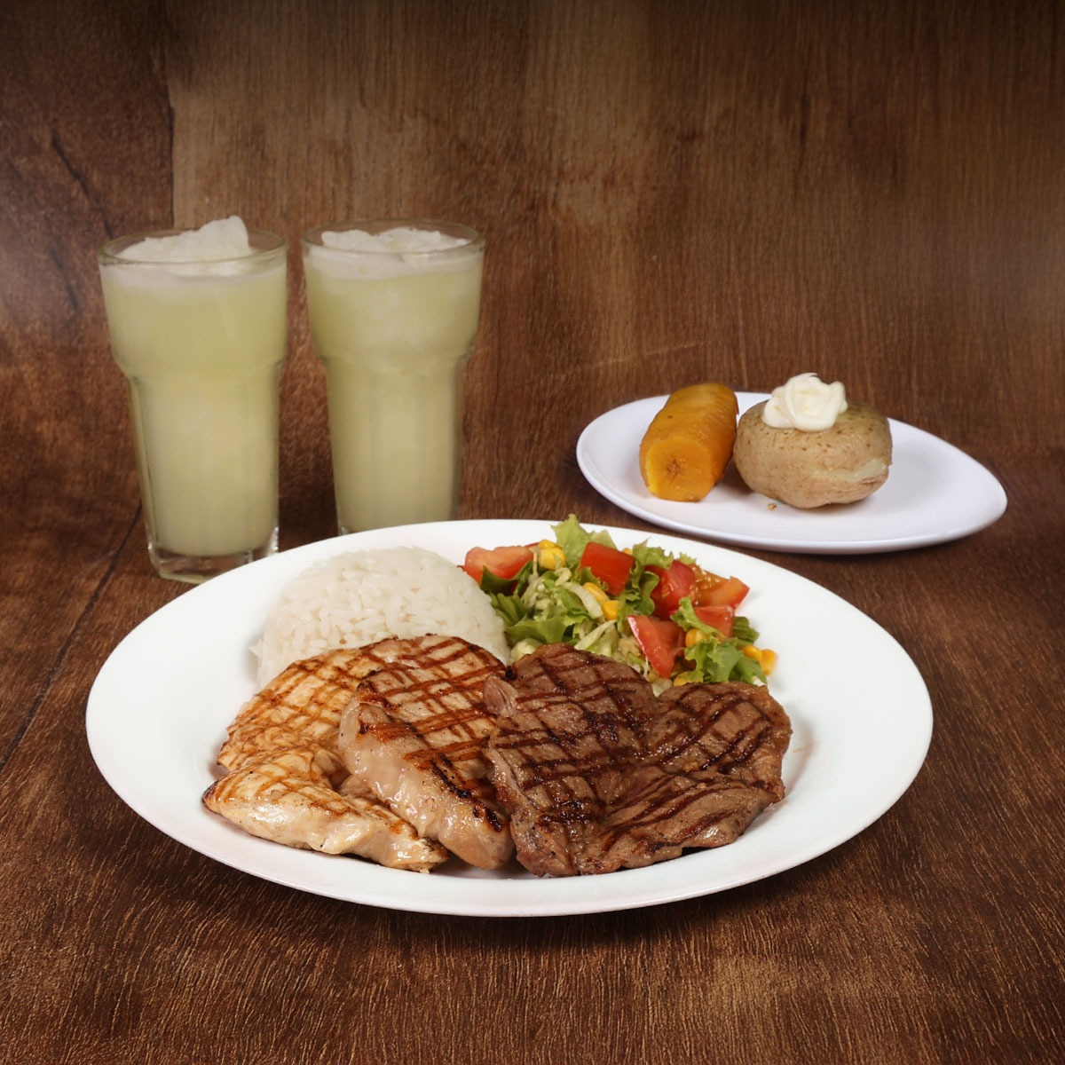 450 Gramos de proteina a la parrilla entre, res, cerdo y pollo. acompañado de ensalada de la casa (contiene, zanahoria, lechuga, tomate y vinagreta de miel mostaza). 1 papa con sour cream y 1 plátano maduro y arroz + 2 limonadas