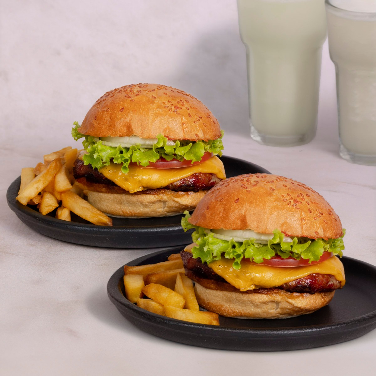 2 hamburguesas de 150G de carne sevillana acompañado de lechuga, cebolla, tomate, queso cheddar y salsas + 2 acompañamientos + 2 bebidas