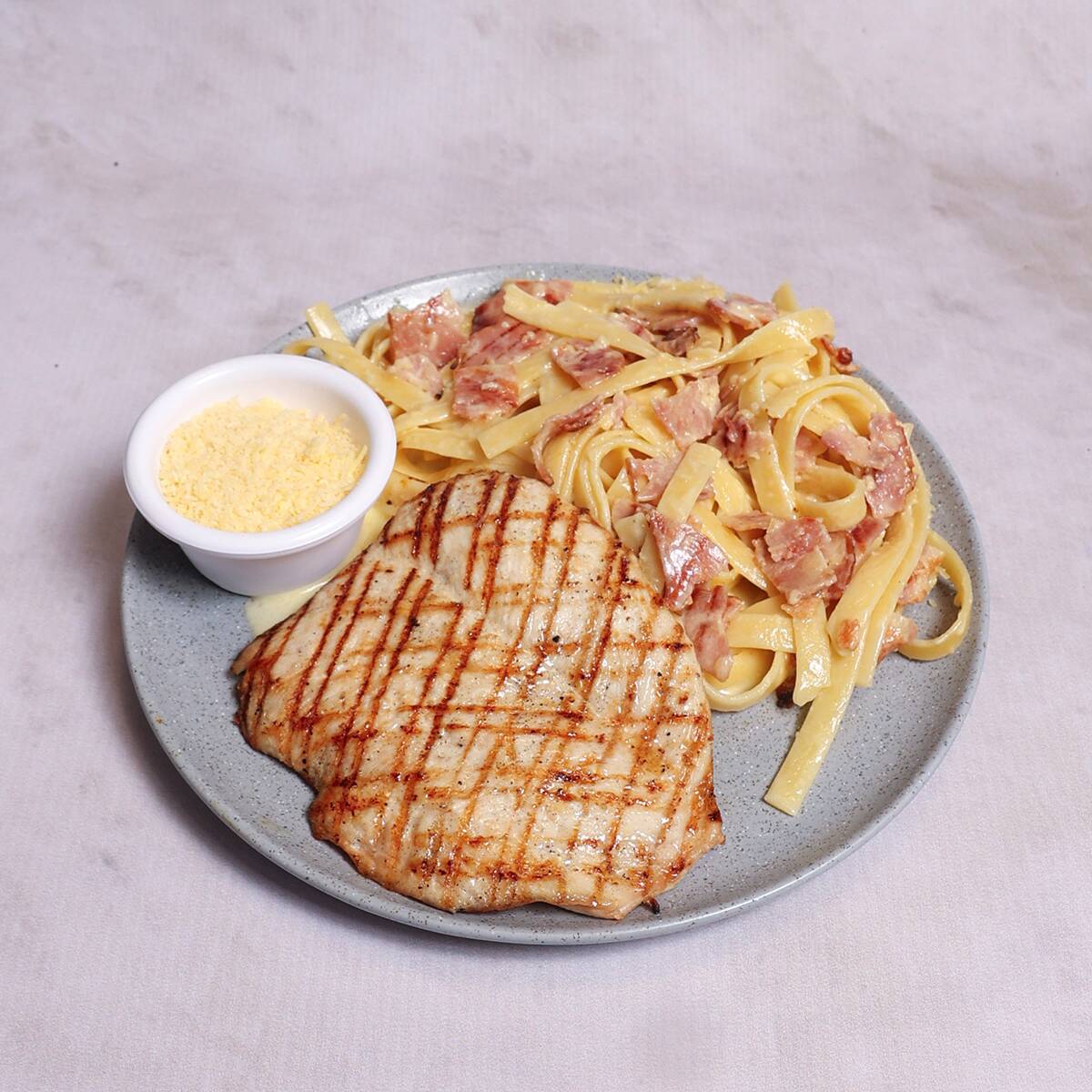 Trocitos de pollo asados a la parrilla (150g), acompañados de nuestra deliciosa Pasta Alfredo y jugo natural.