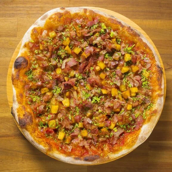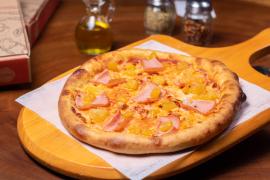 2 pizzas con Tomate san marzano, queso mozzarella, jamónde pierna y piña caramelizada.