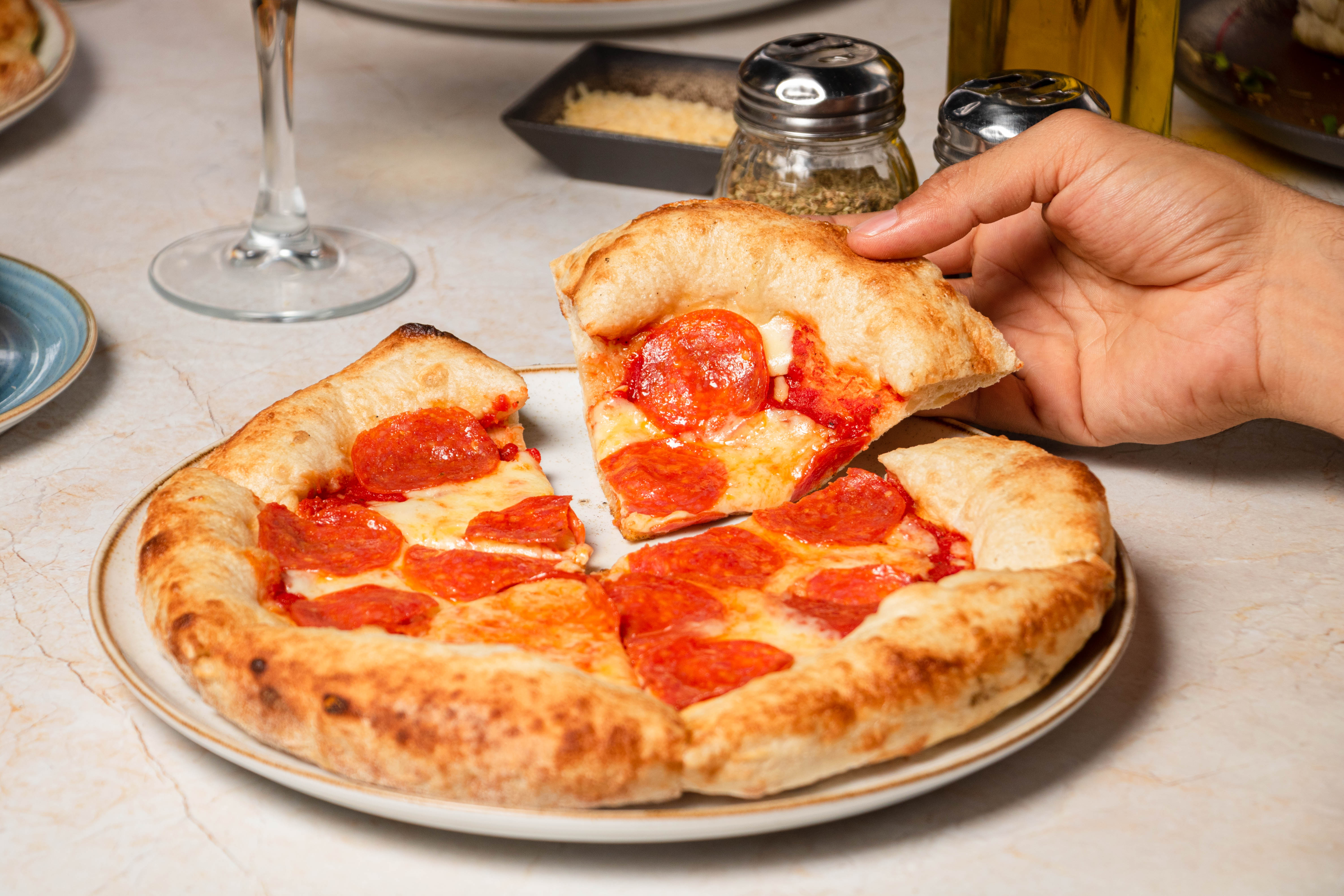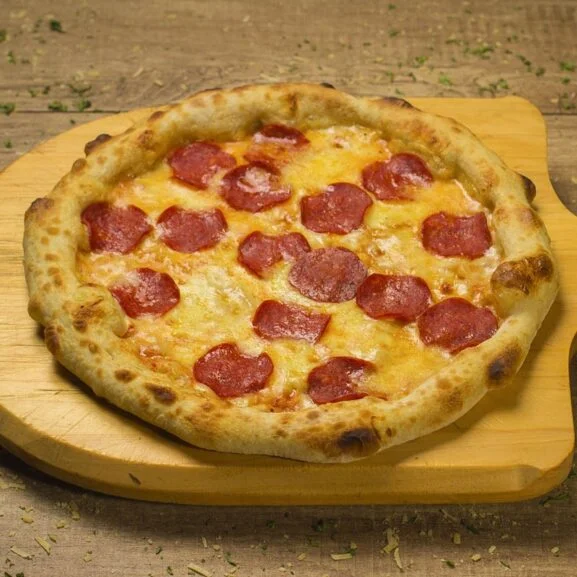 Tomate san marzano, queso mozzarella, peperoni, salami, prosciutto, jamón de pierna y rúgula.