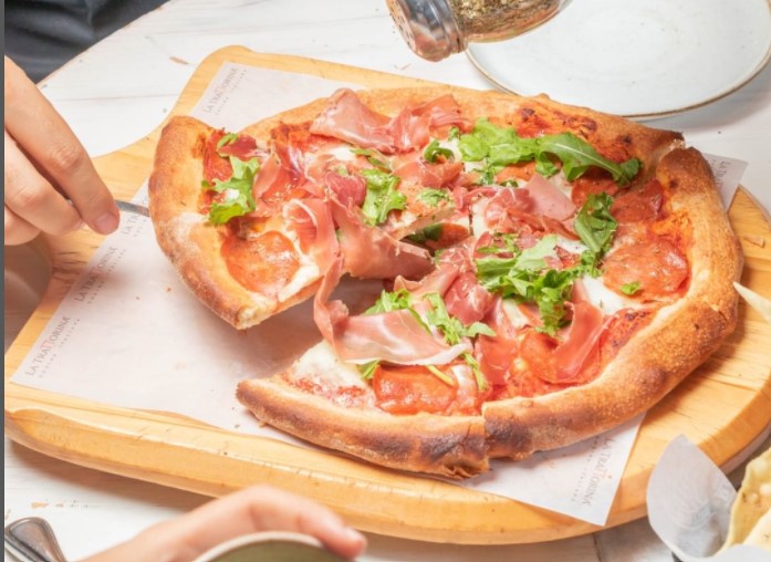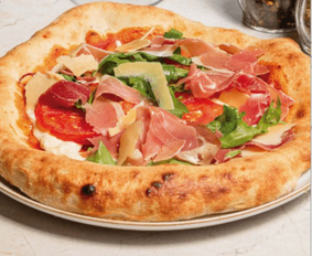 Tomate san marzano, queso mozzarella, stracciatella di burrata, prosciutto, tomate fresco, rúgula y queso parmesano.