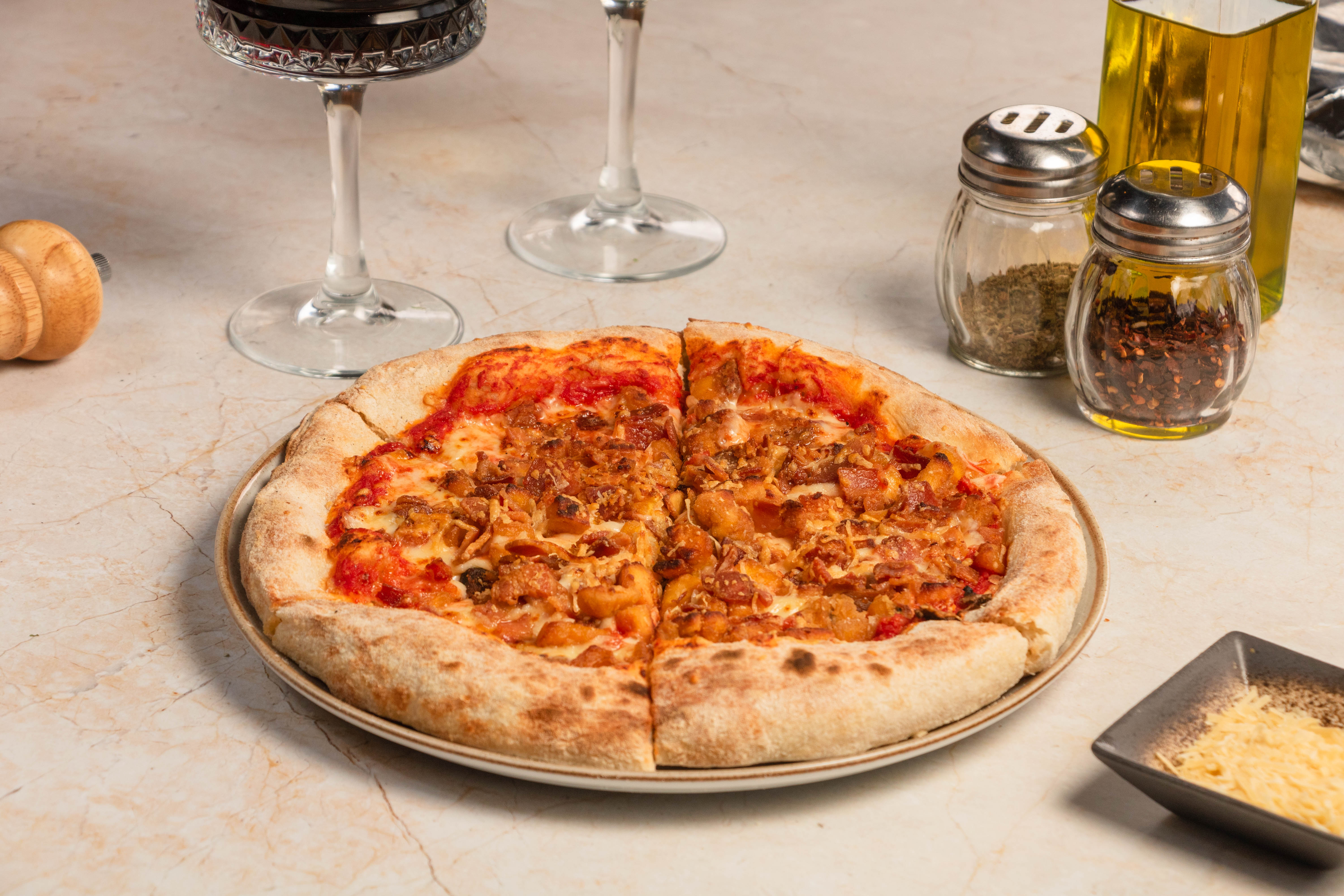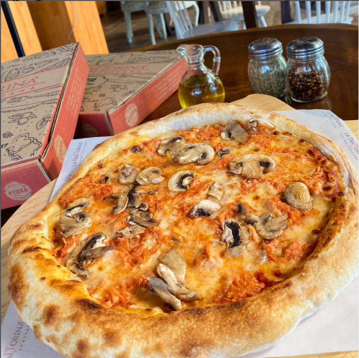 Tomate san marzano, queso mozzarella, pollo y champiñones.