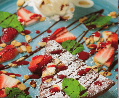 Torta melcochuda de milo hecha en casa, fresas, hierbabuena, salsa de chocolate, salsa de frutos rojos y almendras crocantes, acompañado de helado de vainilla.