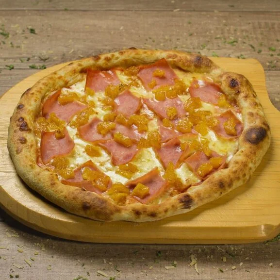 Tomate san marzano, queso mozzarella, jamón de pierna y piña caramelizada.