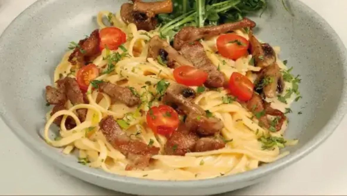 Bondiola de cerdo en salsa blanca, pasta linguini, funghi, tomate cherry y rúgula + limonada natural