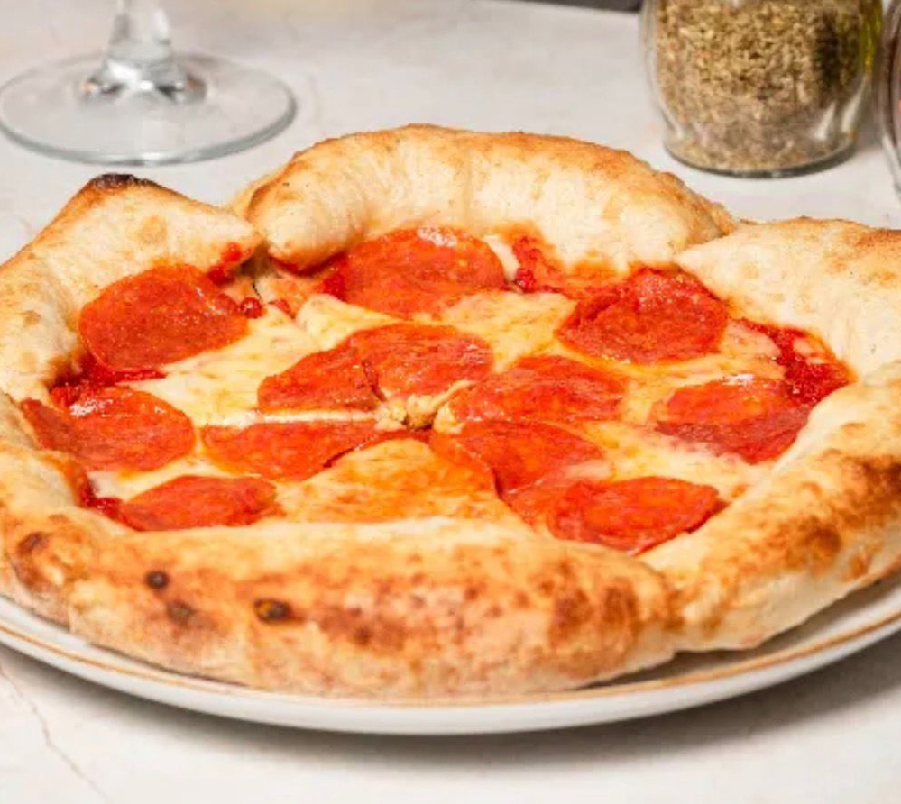 Tomate san marzano, queso mozzarella, peperoni, salami, prosciutto, jamón de pierna y rúgula.