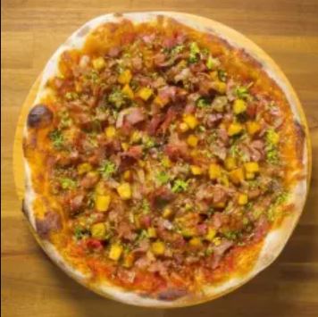 2 pizzas con Tomate san marzano, queso mozzarella, jamónde pierna y piña caramelizada.
