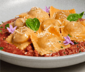 Raviolis rellenos de bolognesa, acompañados con salsa bolognesa.