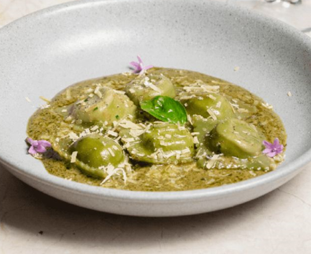 Raviolis rellenos de ricota y espinaca, acompañados con salsa pesto.