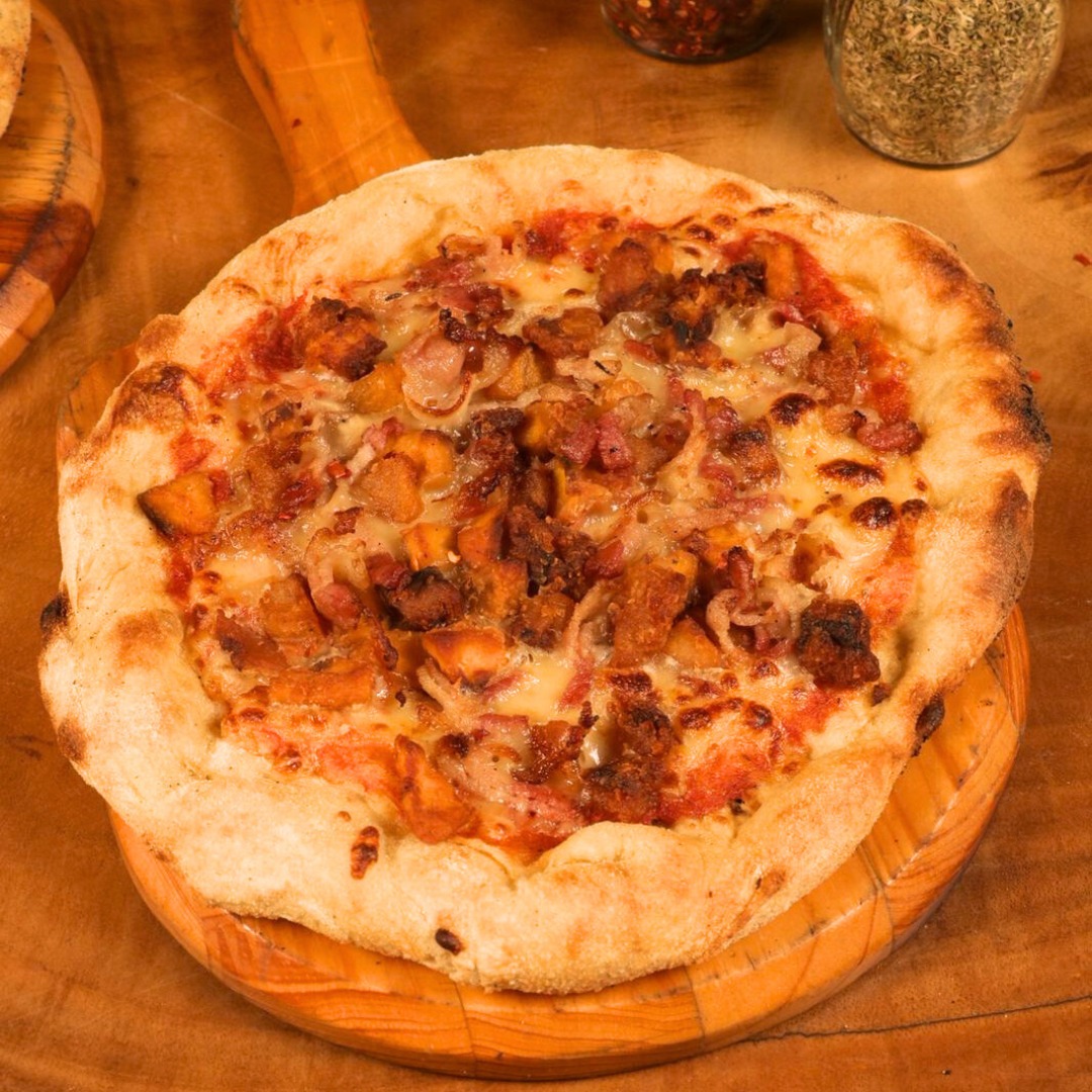 Pizza Personal (4 porciones) Tomate san marzano, queso mozzarella, maduro y pancetta crocante.